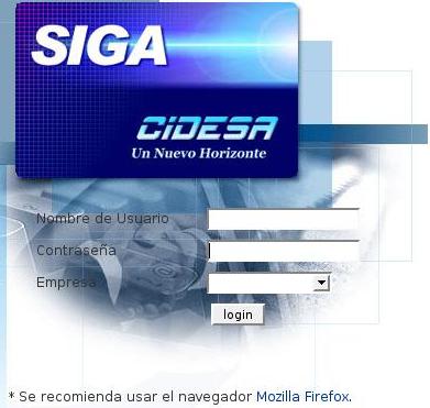 Automáticamente el sistema muestra la Página Principal de SIGA donde visualizará el logo del sistema y los campos Usuario y Contraseña que le permitirán ingresar a SIGA y que fueron definidos con anteriorioridad en el módulo de Seguridad ó Aplicación Maestra .